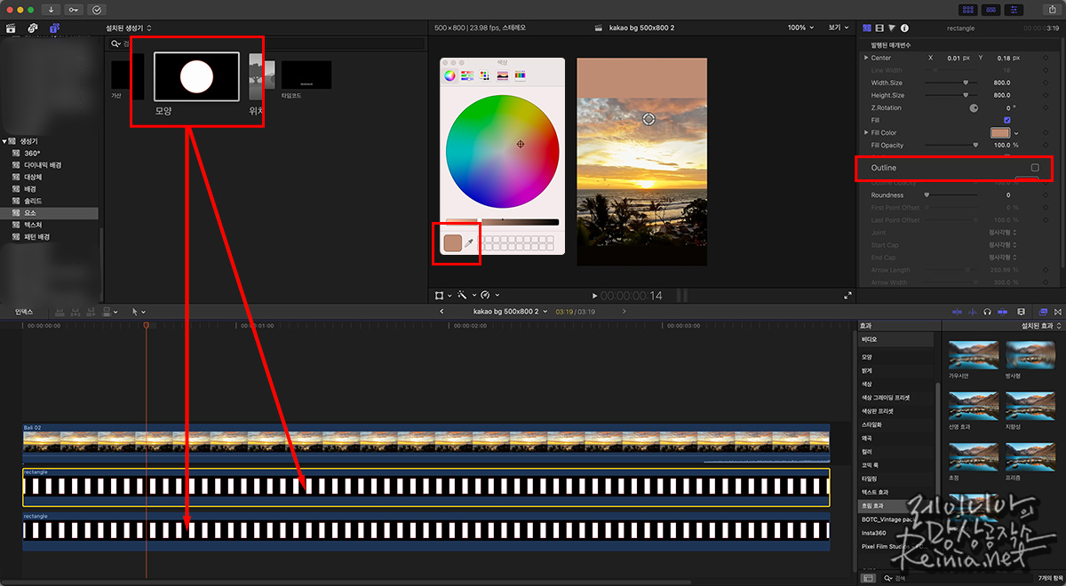 타임라인에 배치된 소스 영상 아래에 요소 생성기 - 모양 생성기를 찾은 뒤 원하는 모양을 넣습니다. 이후 비디오 인스펙터에 들어가 색상과 테두리를 설정합니다. 테두리는 아마 기본이 빨간색일텐데 없애면 되고요. 채우기 색상에서는 스포이드를 선택해 소스 영상에 있는 키 컬러를 선택하면 됩니다.