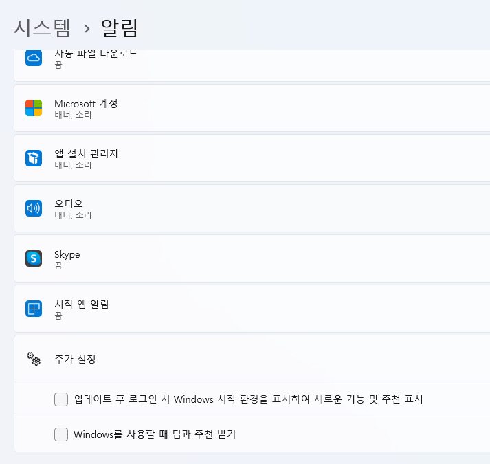 마지막으로 윈도우 설정>시스템>알림 파트에서 Windows를 사용할 때 팁과 추천 받기 등 불필요한 알림을 검색해서 제거해줬습니다.