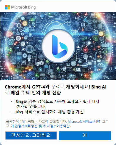 'Chrome에서 GTP-4와 무료로 채팅하세요! Bing AI로 매일 수백 번의 채팅 전환 - Bing을 기본 검색으로 사용해 보세요 - 쉽게 다시 전활할 있습니다. - Bing 서비스를 설치하여 채팅 환경 개선' |