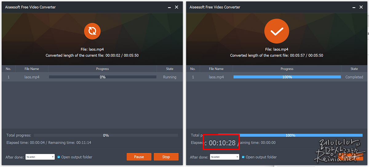 같은 조건 아래에서 변환속도는 모바비 비디오 컨버터와 엇비슷했습니다. 다만, 무료 버전일 때는 최대 5분만 변환이 가능해서 좀 잘렸는데요. 프리웨어에 대한 정책은 장단이 있다 보니 더 마음에 드시는 걸 체험해보시는 게 좋겠습니다.