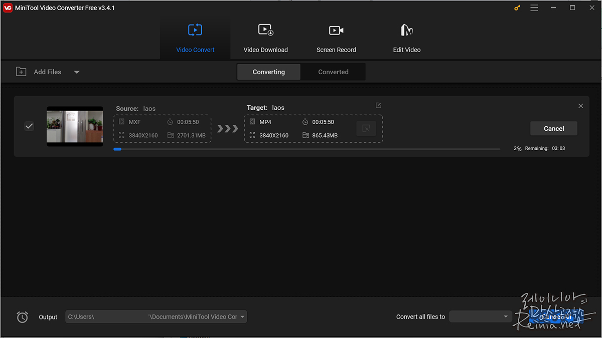 MiniTool Video Converter는 컨버터 외에도 유튜브 영상 다운로드, 화면 녹화 등의 기능을 지원합니다. MXF 파일을 MP4로 변환하는 것도 지원하는데요. 다만, 테스트하는 환경이 나빠서 그런지 뭔가 문제가 있는 건지 제 환경에서는 2% 이후로 변환이 진행되지 않아서 최종 완료시간은 체크할 수 없었습니다.
