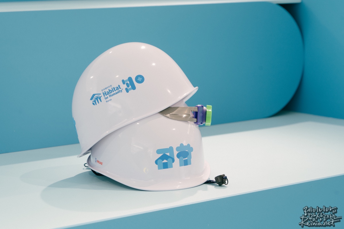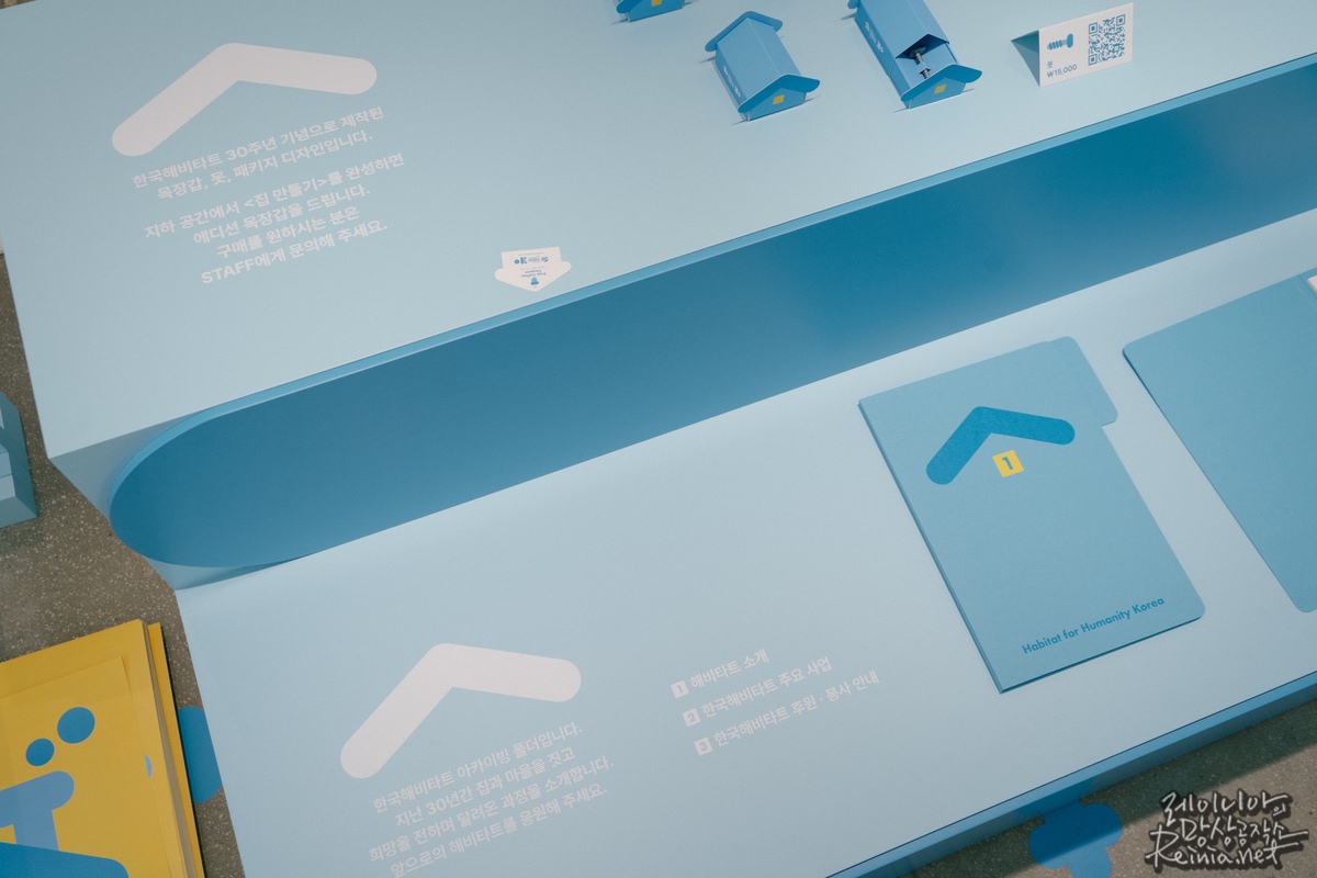가장 먼저 눈길을 사로잡는 것은 팝업스토어 내부에서 외부까지 뻗어나온 대형지붕입니다. 이 조형물이 집의 형상을 드러내는 단적인 요소인데요. 내부에 들어서면 하얀색, 하늘색, 노란색으로 꾸며진 깔끔한 공간과 함께 다양한 굿즈, 그리고 해비타트 활동을 정리한 파일을 볼 수 있습니다.