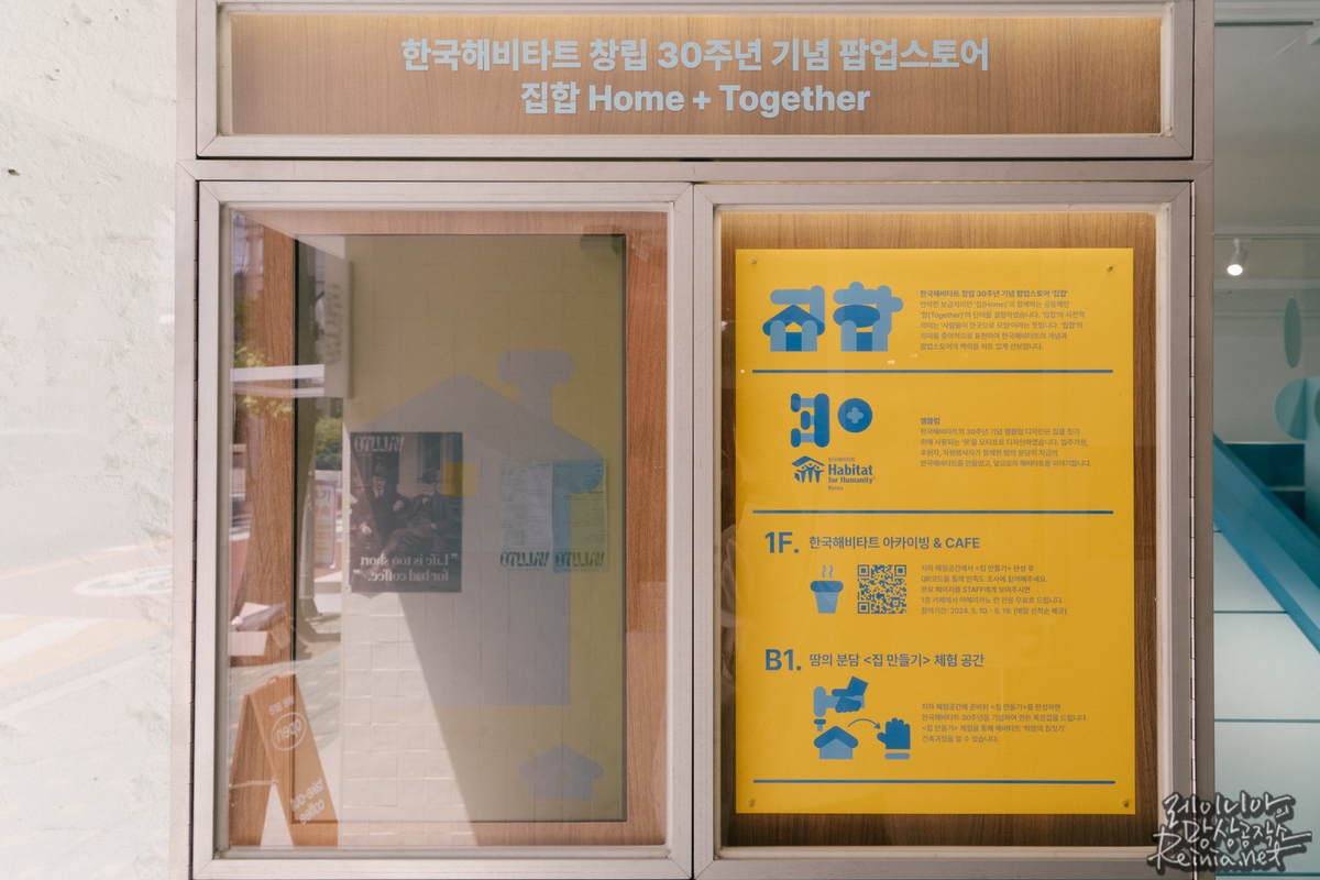 지난 10일부터 19일까지, 성수동 카페거리 근처 '세퍼레이츠'에서 열리는 팝업스토어는 한국해비타트의 지나온 길과 그간의 사업, 그리고 독특한 기념품과 체험활동이 맞물려 있는 공간이었는데요. 모두에게 열려있는 공간입니다만, 저는 일을 겸해 첫날 일찍 이곳을 찾았습니다.