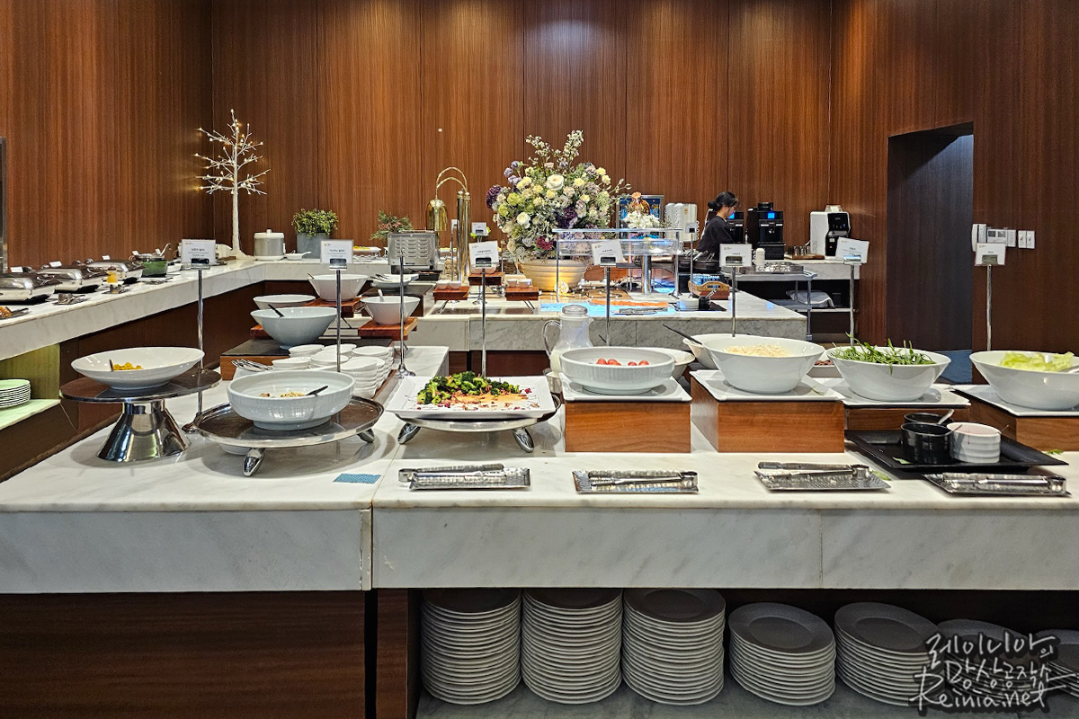 조식은 사전 예약 시 1인당 15,000원(현장 결제 16,000원)에 이용할 수 있었습니다. 사전 예약은 최소 전날부터 프론트에서 결제할 수 있었는데요. 2025년부터는 16,000원(현장 18,000원)으로 인상됐습니다. 죽 같은 한식부터 계란, 소시지 등의 양식까지 다양한 메뉴가 준비돼 있었습니다.