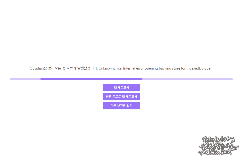 옵시디언을 열면 약간의 로딩이 생기는데요. 갑자기 위와 같은 메시지가 표시되더니 더이상 진행이 되지 않았습니다. 앱을 재시작하거나 안전 모드로 재시작하라고 했지만, 어떤 선택지를 선택해도 별도의 반응은 없었습니다.